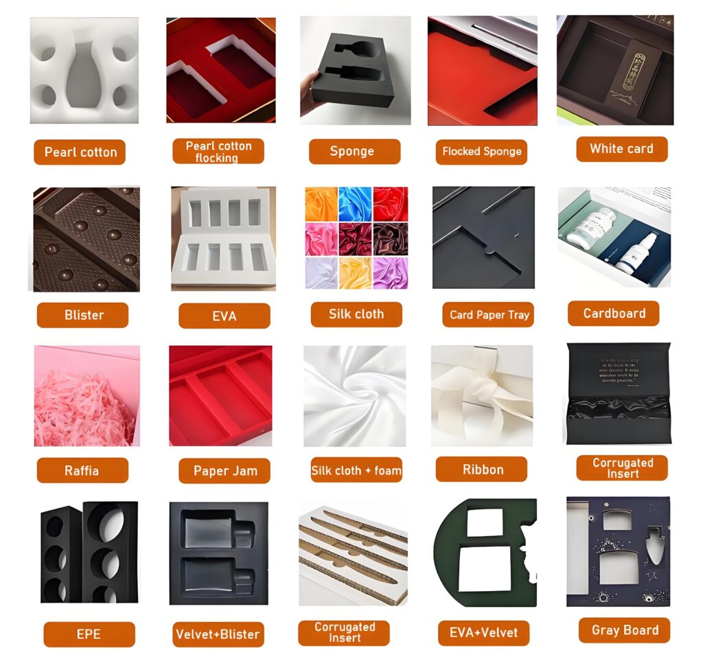 Custom inserts such as EVA, sponge, cardboard trays, and fabric liners are provided to secure products, improve unboxing experience, and prevent damage.
