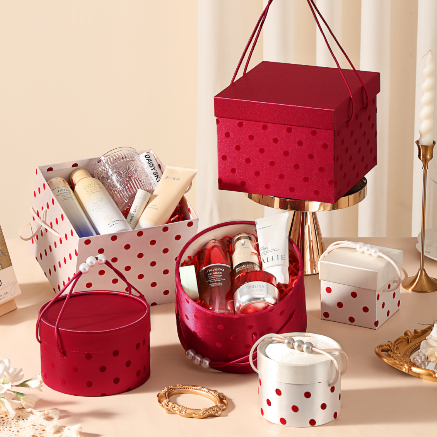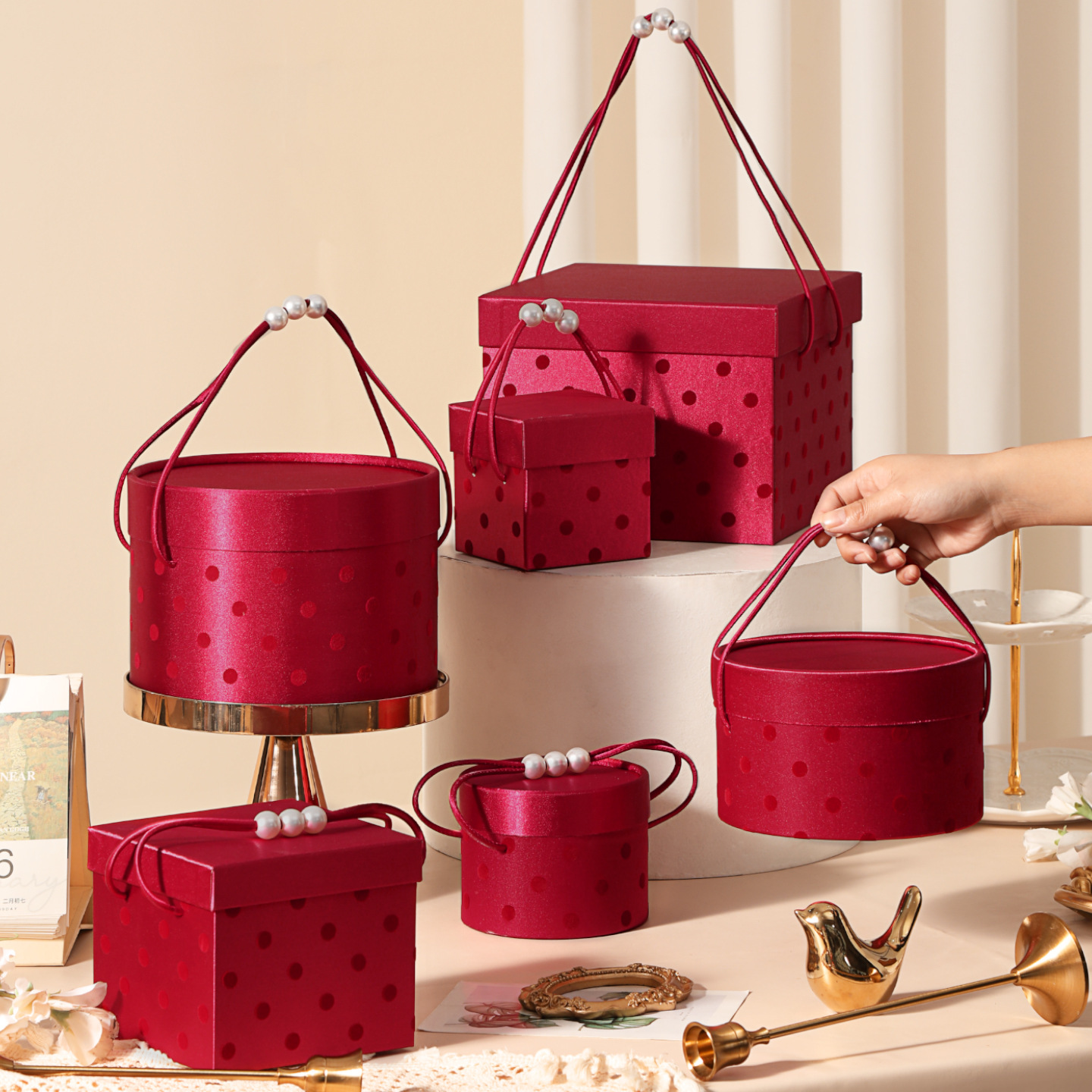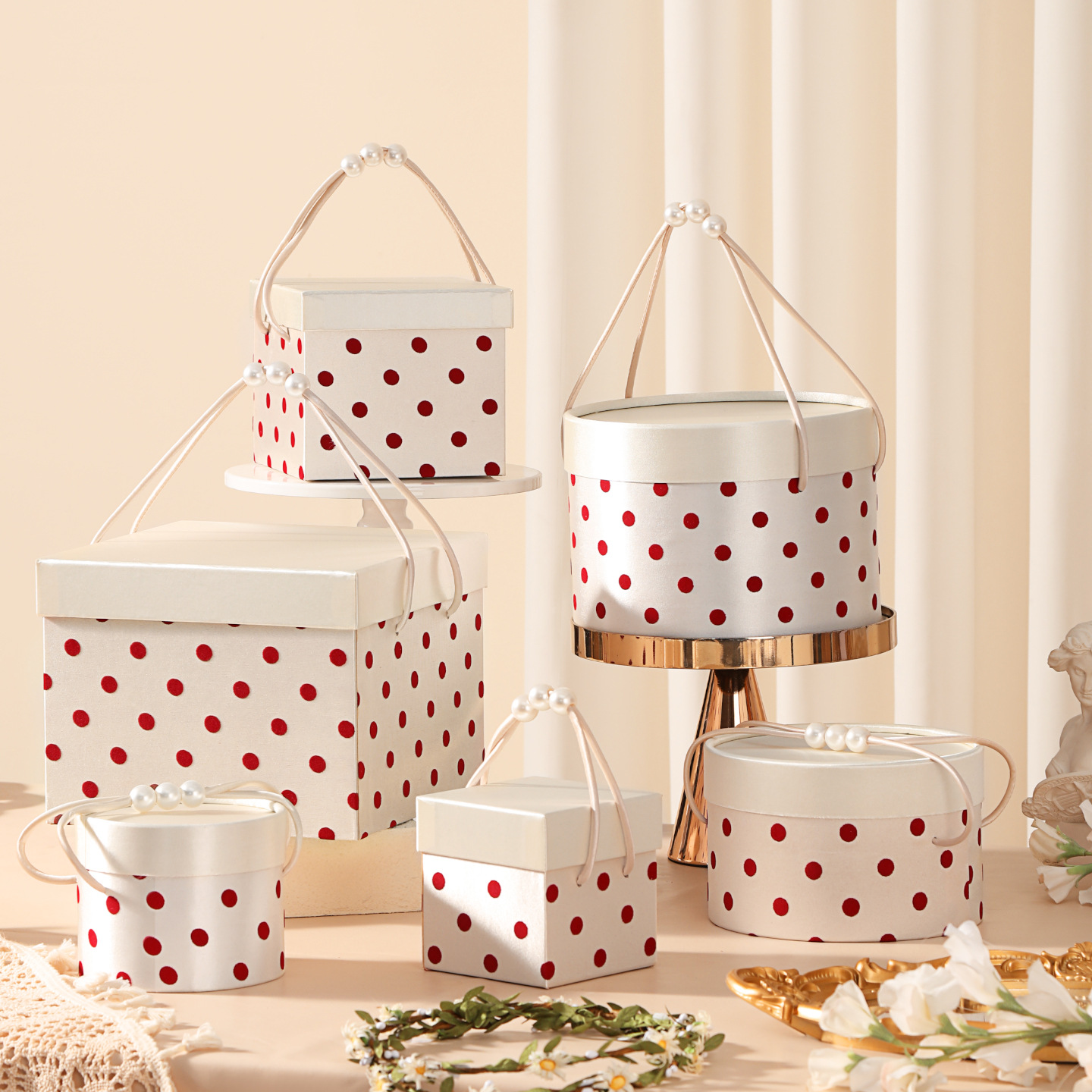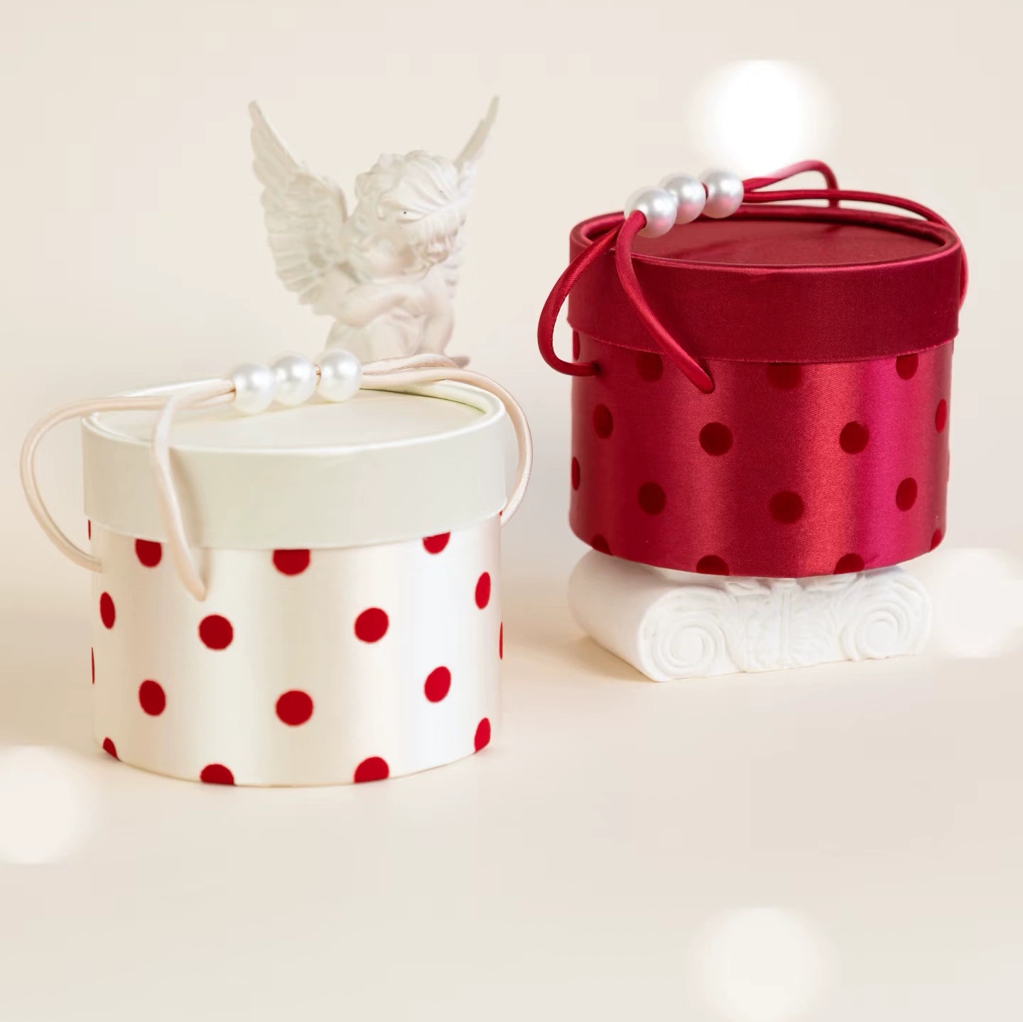 Chic Polka Dot Round Gift Boxes with Pearl Handle, Custom Luxury Packaging for Weddings, Parties & Gifts